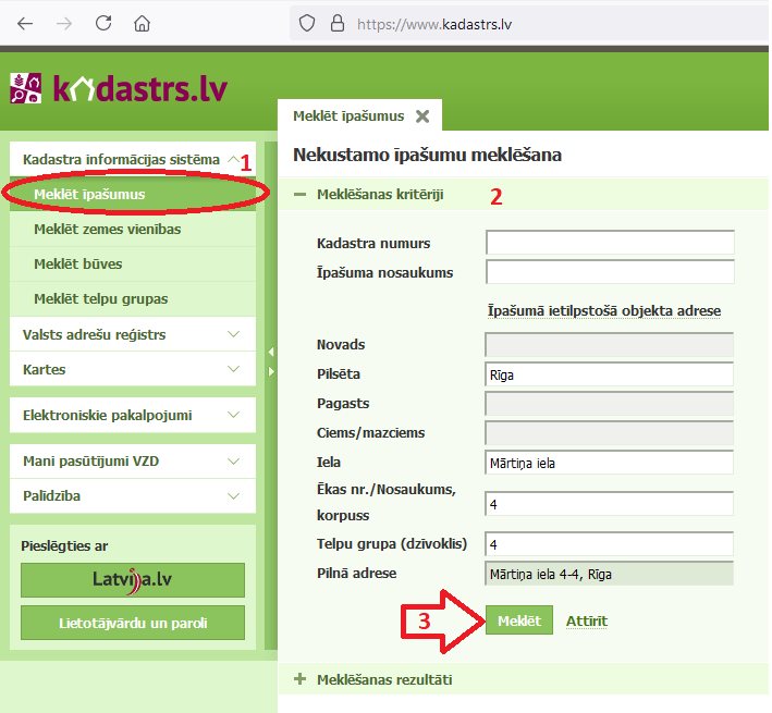 1. Выбираем раздел "Meklēt īpašumus"¶