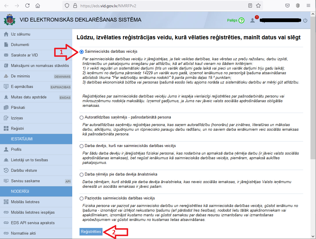 1. Выбрать раздел "Saimniecicskās darbības veicējs"¶
