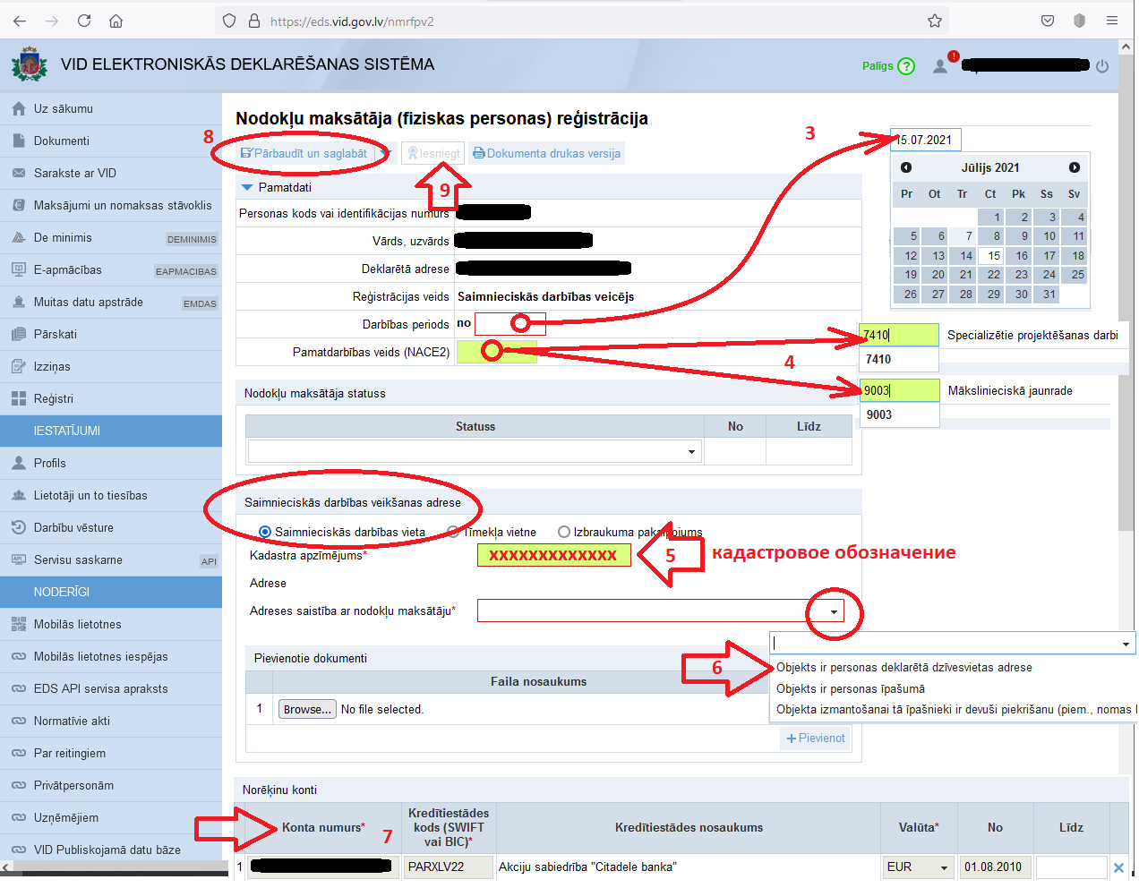 После заполнения обязательных полей (п. 3 - 7) становиться доступной кнопка "Pārbaudīt un saglabāt".